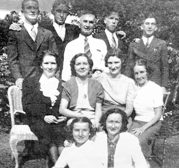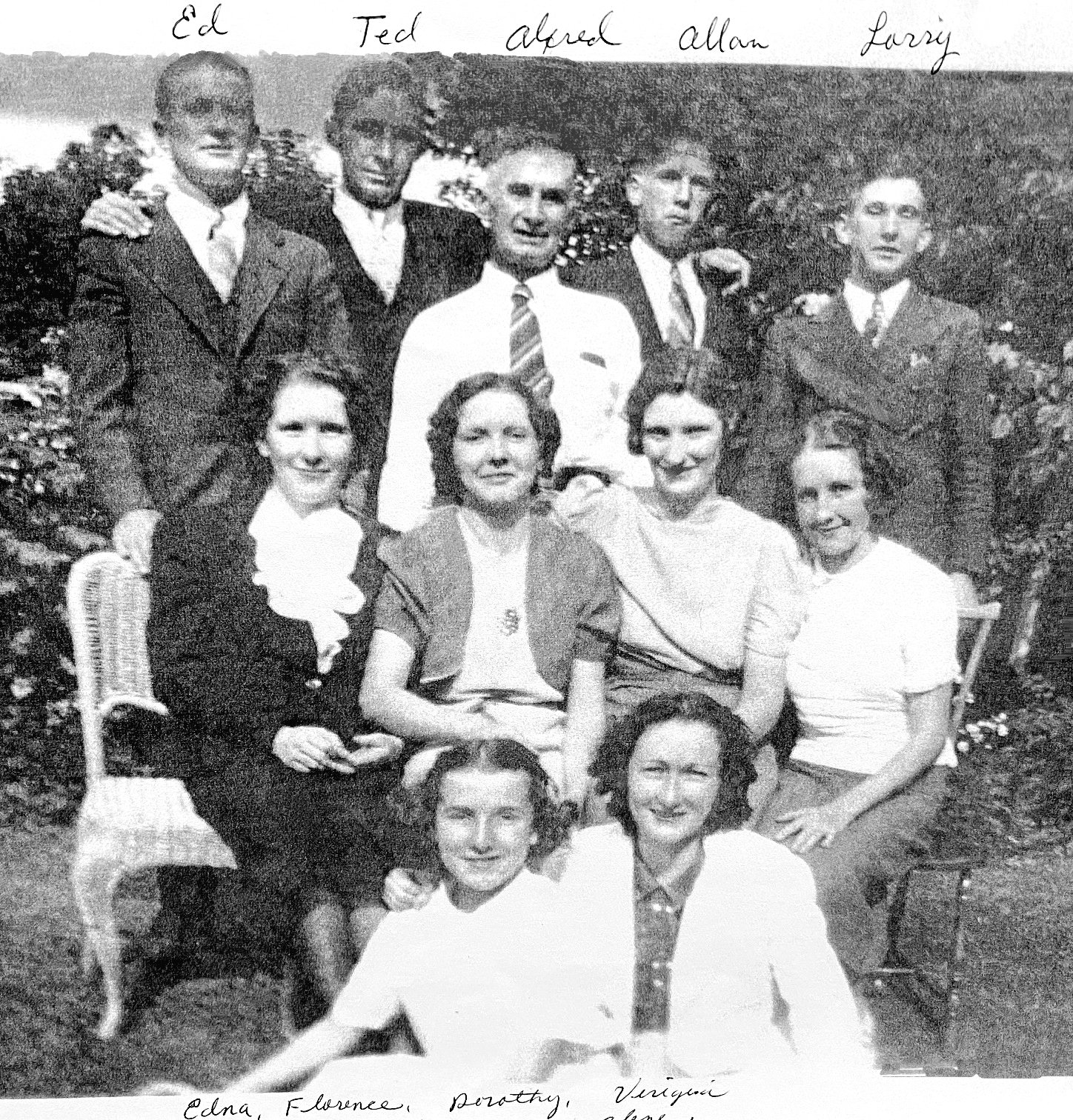 ![]() Alfred Blaney and adult children Back L-R: Edwin, William Alfred Jn, William Alfred Sn, William Alfred Sn, Allen Evans & Lawrence George Sitting on chairs row L-R: Edna, Florence, Dorothy, & Virginia. Front L-R: Elizabeth Jane; Alene |