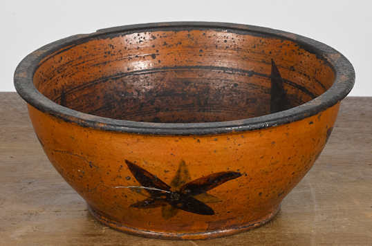 Fayette County, Pennsylvania redware bowl, 19th c., signed by the maker Justus L. Blaney (Cookstown 1809-1875),