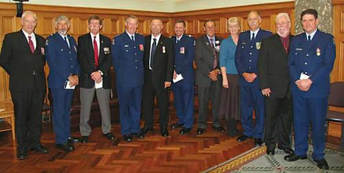 Current and former Police Officers at the NZSSM (Erebus) presentation. From left: Retired Superintendent Robert Mitchell, Senior Constable Alan Campbell, Retired Sergeant Mark Penn, Inspector Greg Gilpin, Retired Inspector Bruce Blayney, Sergeant Allan Cantley, Retired Sergeant Graham Webby, Retired Constable Catherine Ahuriri, Inspector Alastair (Roly) Williams, Retired Constable Trefor Jones, Inspector Stu Leighton. | |