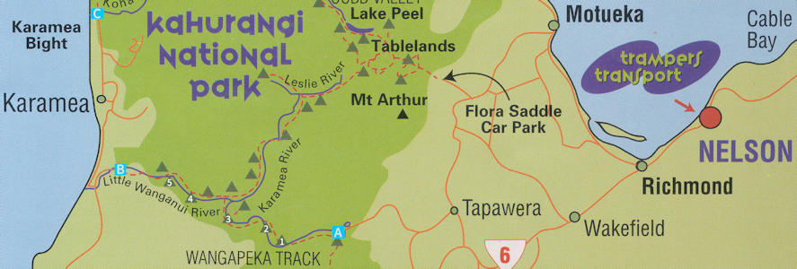 Wangapeka-Heaphy map. A=Wangapeka River Rd, near Tapawera; B=Wangapeka Rd, near Karamea;