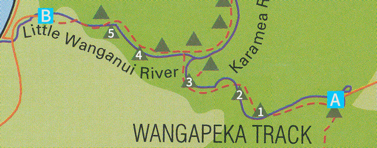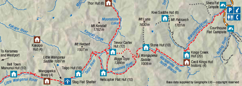 Huts 1=Kings Creek; 2= Stone; 3=Helicopter; 4=Taipo; 5=Little Wanganui Hut (replaced now).