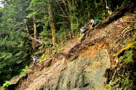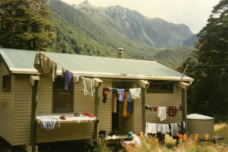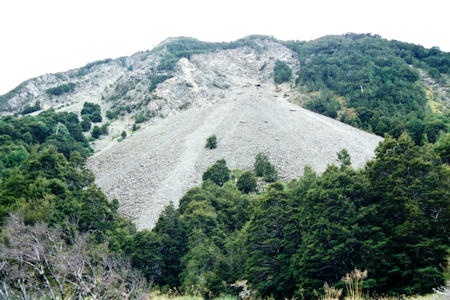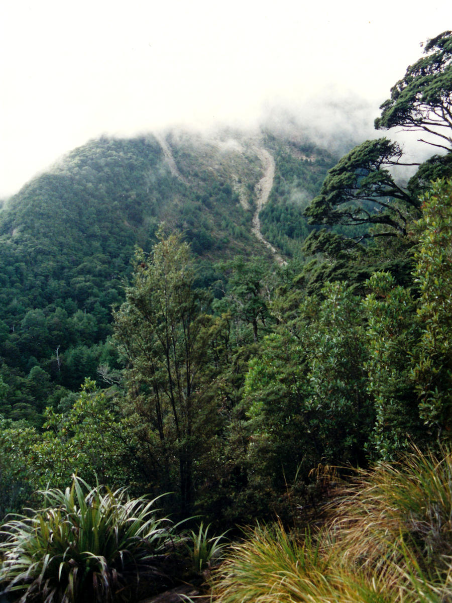 Having crossed the easy Wangapeka Saddle, we saw more slips, "3 wire" crossings (only use if flooding), a pesky possum (euthanised), a blue pixie fungus, a Tabernacle, a fractured arm (Cathy), an injured tramper we treated and arranged helicopter evacuation from Taipo Hut, and mist and rain on the grunty Little Wanganui Saddle.