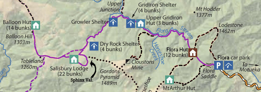 8th March 2003: Flew to Nelson then taken by minibus to the Flora entrance of the Kahurangi National Park. Trampers were Ian Bardsley (retired manager), Alan Rogers (lab manager), John Barrell (gas engineer), John Sutton (engineer), Graham Thompson (engineer), Jim Callaghan (retired teacher) and moi, Keith Blayney (GP). We passed the now familiar Flora Hut and the Gridiron, then Dry Rock shelters to come out on the tussock below Salisbury.