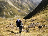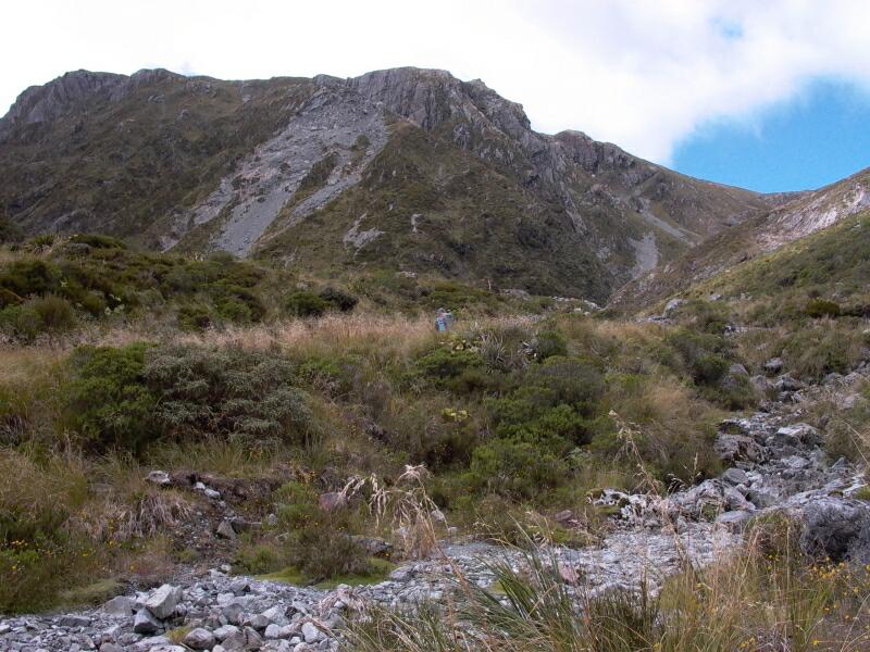 The descent was not entirely without mishap. Jim left a fair bit of skin on a rock, the track disappeared and a number of inconsistent marker poles were spotted around the valley floor and I discovered that the clump of grass used to slow up my descent was a variety of Aciphylla ?subflabellata (Speargrass) - NOT advisable!!