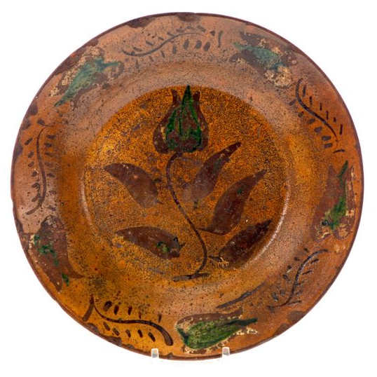 Description: SIGNED REDWARE PIE PLATE. Pennsylvania, mid 19th century. Green & yellow slipware tulips.