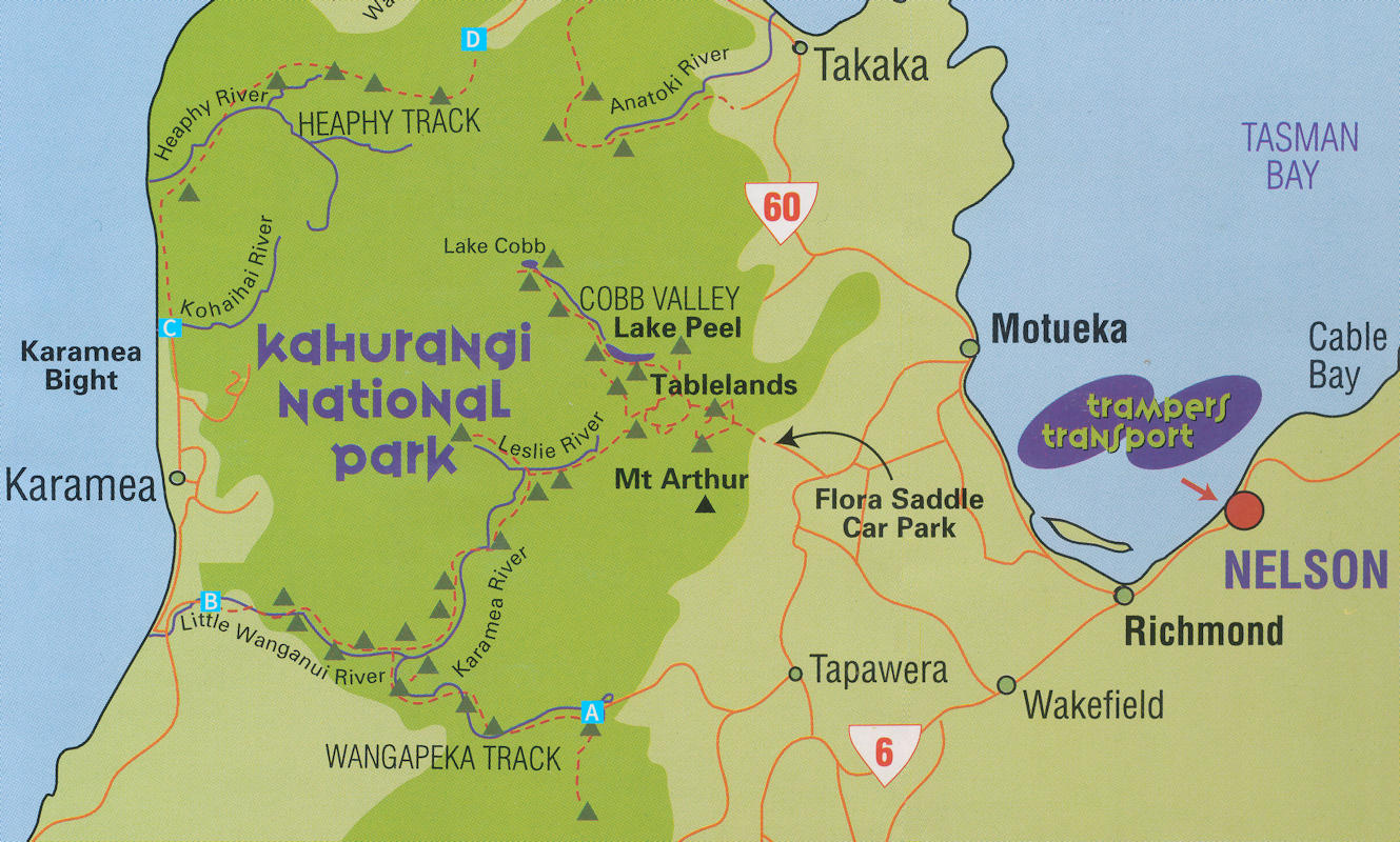 Wangapeka-Heaphy map. A=Wangapeka River Rd, near Tapawera; B=Wangapeka Rd, near Karamea;