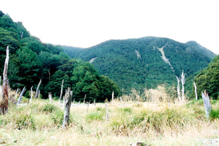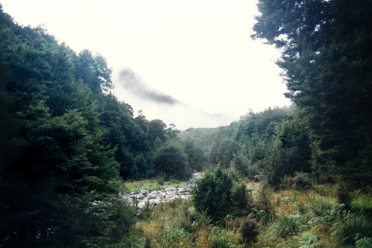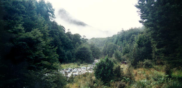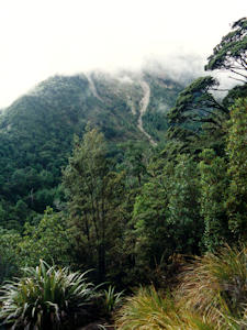 Having crossed the easy Wangapeka Saddle, we saw more slips, "3 wire" crossings (only use if flooding), a pesky possum (euthanised), a blue pixie fungus, a Tabernacle, a fractured arm (Cathy), an injured tramper we treated and arranged helicopter evacuation from Taipo Hut, and mist and rain on the grunty Little Wanganui Saddle.