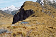 At the top of the tussock basin there is a relatively short 100m climb to the saddle (1447m) where there is a large tarn and beyond this a small hill worth climbing to obtain 360° views of three valleys. The rock dome on top is quite safe unless one tries to take a 360° video and steps off the edge (as I did!). Luckily there is no audio track on my camera!