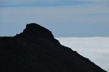 We sat on a rock to have lunch and the Greek Lady (Maria, of course) who had got me to take some photos of her on the way up caught up with us. She was quite concerned about the descent so I lent her my pole as I had no intention of needing it! The views "above the clouds" were spectacular, with Taranaki just able to be made out peaking up through the clouds in the third shot (looking west).